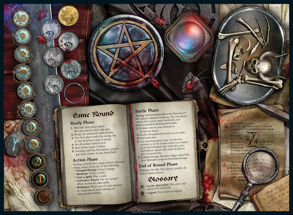 Each game you will create a unique sorcerer by combining a Character Deck, a Lineage Deck, and a Domain Deck. Shuffle them together to form your grimoire (which contains your dark magic and evil minions) and you are ready to play!