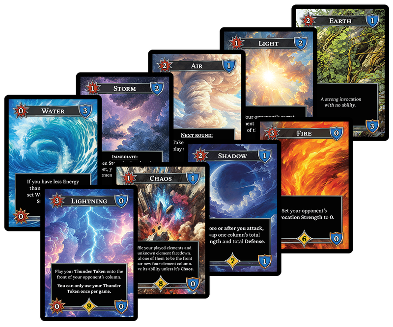 Draft, play, and combine elemental forces to outmaneuver your opponent in a contest of strength and skill. Will you master the balance of fire, water, air, and shadow—or be consumed by chaos? With every round offering new tactical decisions, only the most cunning elemental will claim victory!