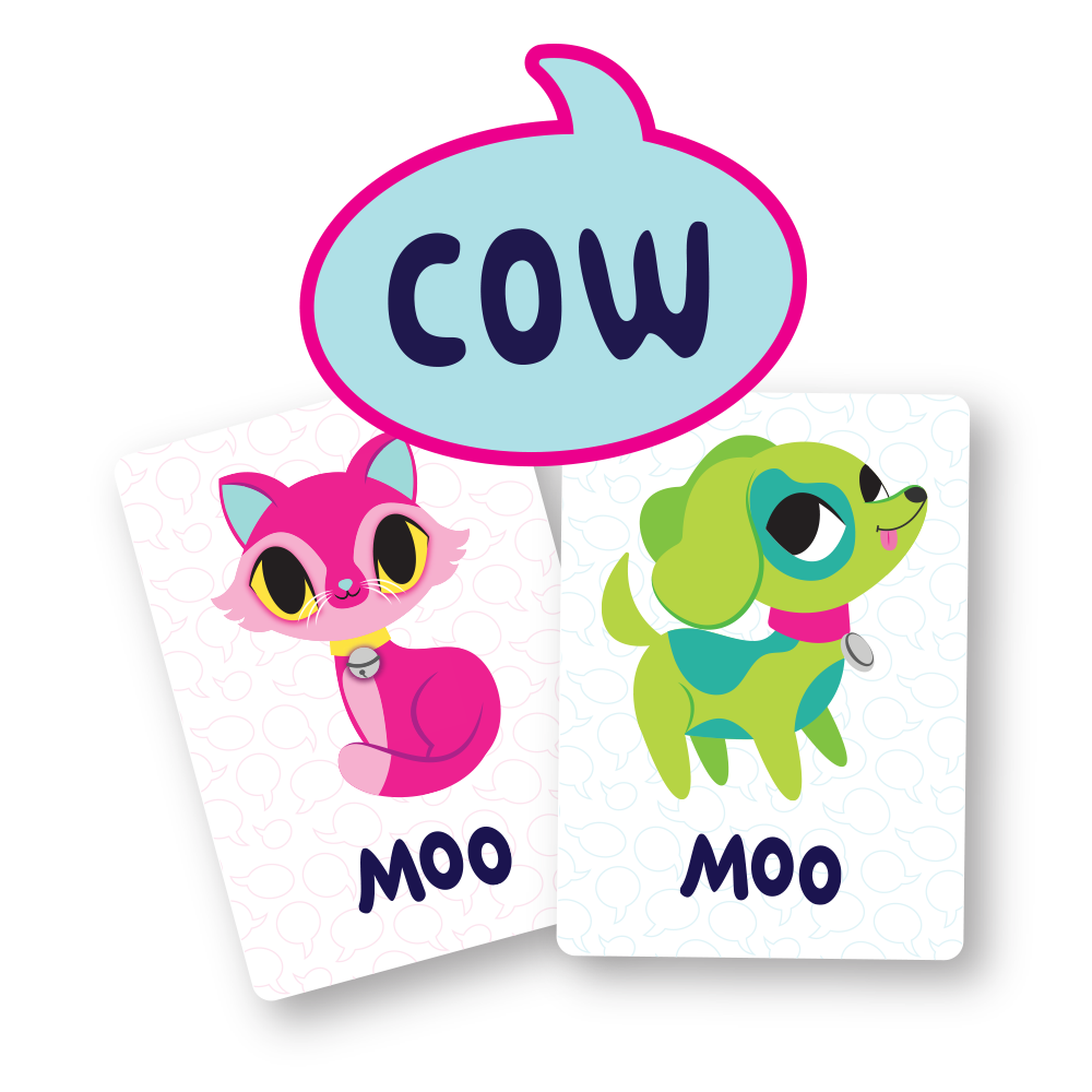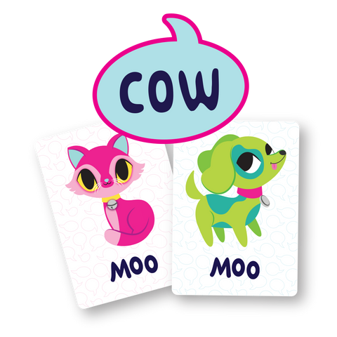 Sounds easy, except along with the picture, each card also has the sound a DIFFERENT animal makes written below it. If those sounds match, yell out the animal! Do you meow or moo? oink or call out pig? Can your brain keep up with your mouth to score the most points?